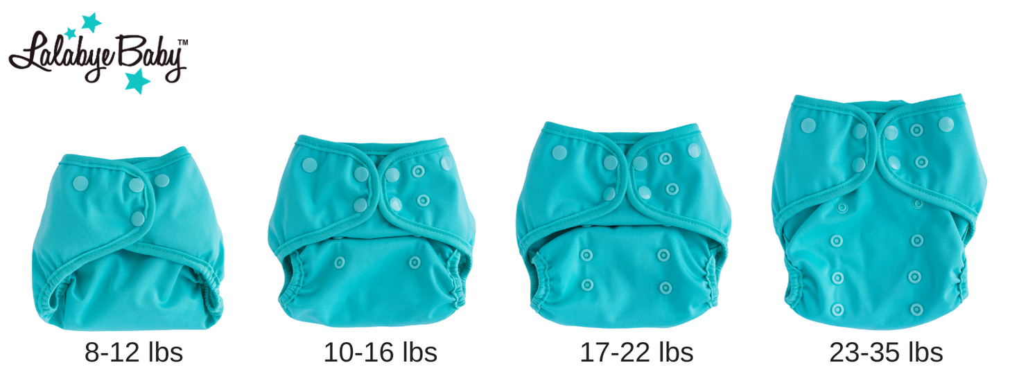 Lalabye Baby Covers are a one-size diapering system designed to fit from birth to potty training (approximately +/- 8 to 35 pounds). Rise snaps adjust the length of the diaper and hip and waist snaps adjust the width to fit extra small (newborn), small, medium, and large sizes and a variety of body shapes and sizes.